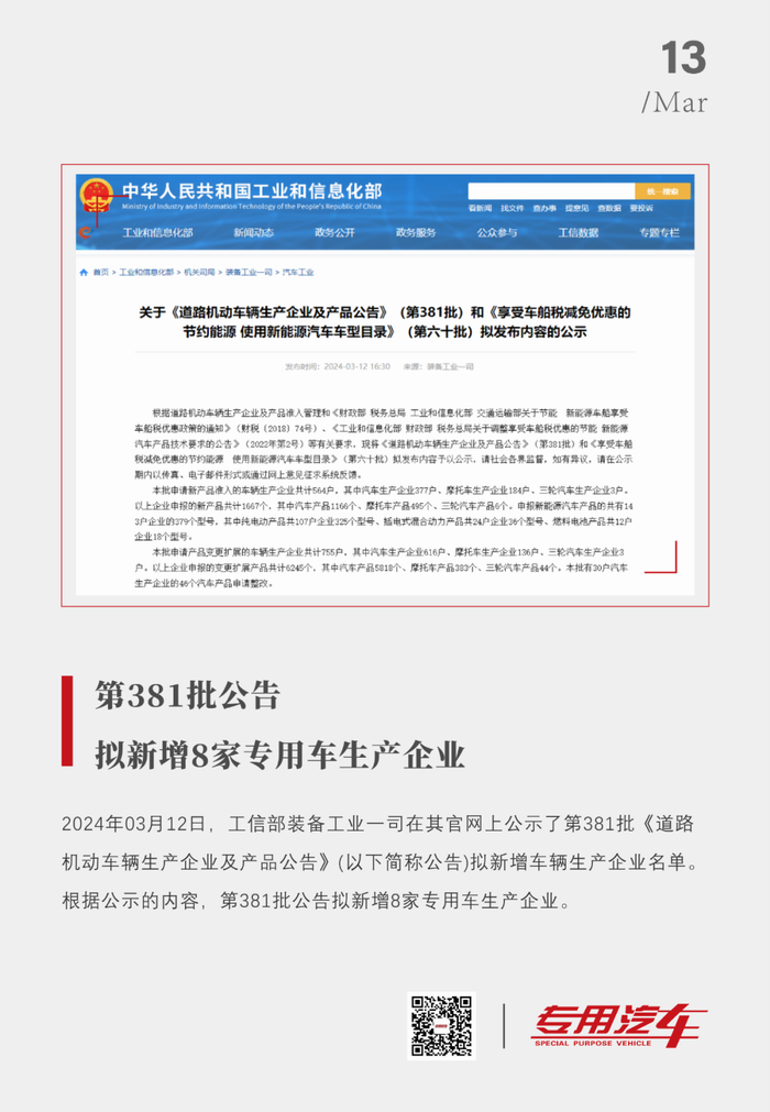 2024年03月12日,工信部裝備工業(yè)一司在其官網(wǎng)上公示了第381批《道路機(jī)動車輛生產(chǎn)企業(yè)及產(chǎn)品公告》(以下簡稱公告)擬新增車輛生產(chǎn)...