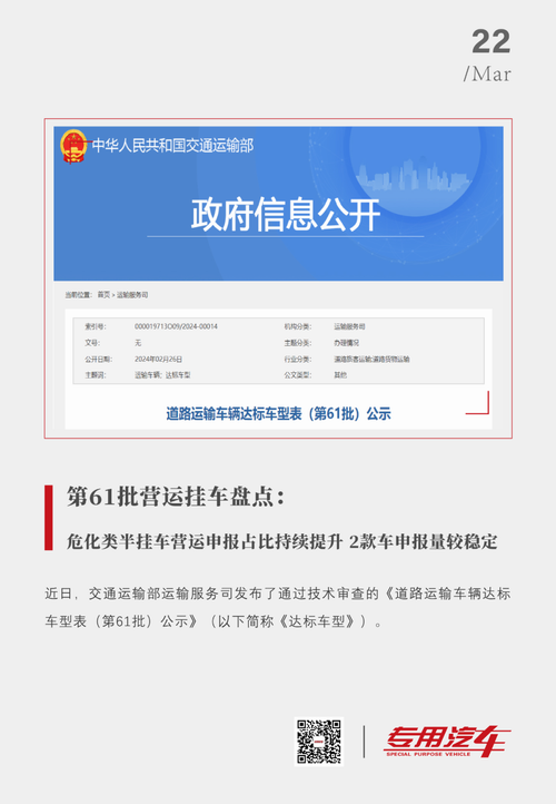 近日,交通運(yùn)輸部運(yùn)輸服務(wù)司發(fā)布了通過技術(shù)審查的《道路運(yùn)輸車輛達(dá)標(biāo)車型表(第61批)公示》(以下簡稱《達(dá)標(biāo)車型》)。