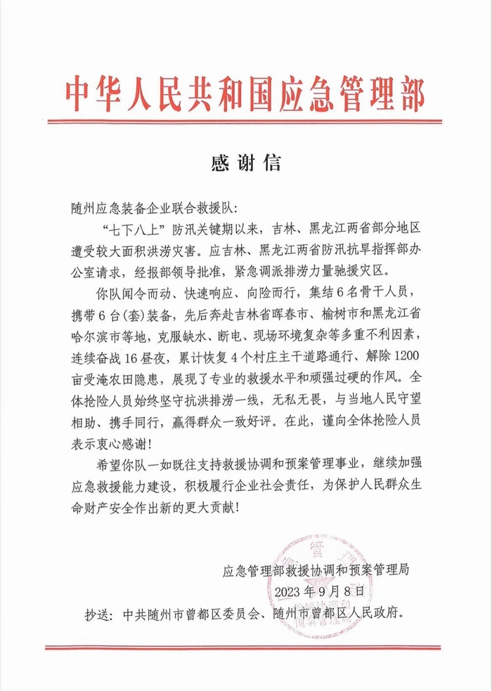 9月8日,隨州應急裝備企業(yè)聯(lián)合救援隊收到了來自應急管理部救援協(xié)調(diào)和預案管理局的感謝信。 8月以來,河北、吉林、黑龍江等地陸續(xù)...