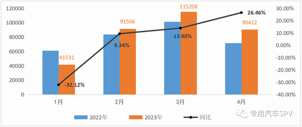 2023年1-4月,899家專用汽車企業(yè)共銷售專用汽車(六大類)共33.87萬輛,同比上漲6.66%。2023年除1月份同比下滑之外,2-4月銷量同...