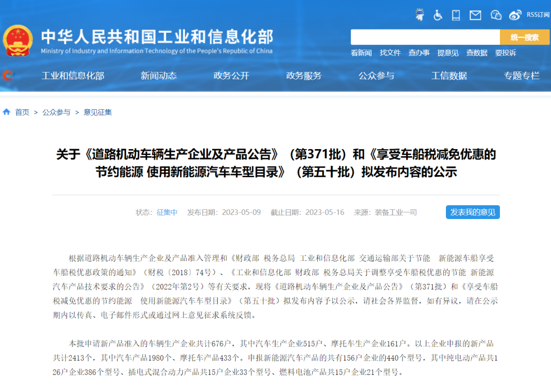 2023年5月9日,工信部裝備工業(yè)一司在其官網(wǎng)上公示了第371批《道路機(jī)動(dòng)車輛生產(chǎn)企業(yè)及產(chǎn)品公告》(以下簡稱公告)擬新增車輛生產(chǎn)企...