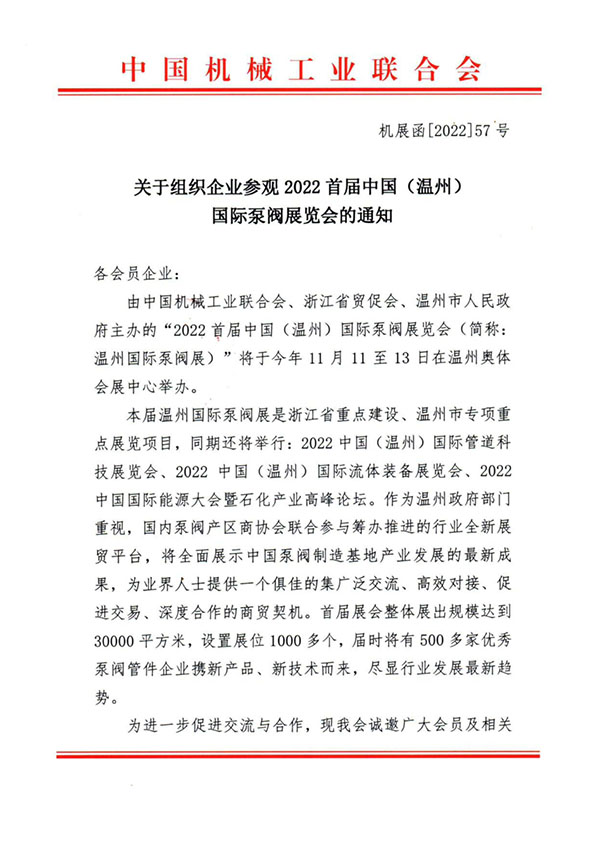 各會員企業(yè)∶ 由中國機械工業(yè)聯(lián)合會、浙江省貿(mào)促會、溫州市人民政府主辦的“2022首屆中國(溫州)國際泵閥展覽會(簡稱∶溫州...