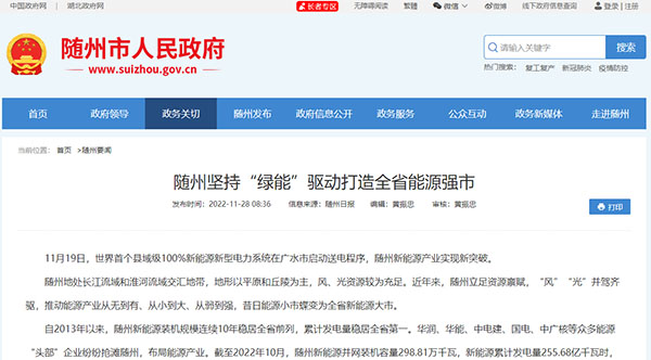 11月19日,世界首個縣域級100%新能源新型電力系統(tǒng)在廣水市啟動送電程序,隨州新能源產(chǎn)業(yè)實現(xiàn)新突破。