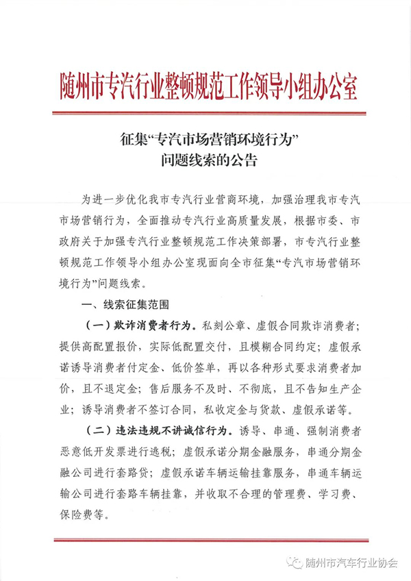 征集“專汽市場(chǎng)營(yíng)銷環(huán)境行為”問(wèn)題線索的公告