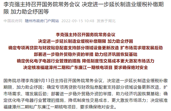 國(guó)務(wù)院總理李克強(qiáng)9月13日主持召開國(guó)務(wù)院常務(wù)會(huì)議,決定進(jìn)一步延長(zhǎng)制造業(yè)緩稅補(bǔ)繳期限,加力助企紓困;確定專項(xiàng)再貸款與財(cái)政貼息配...
