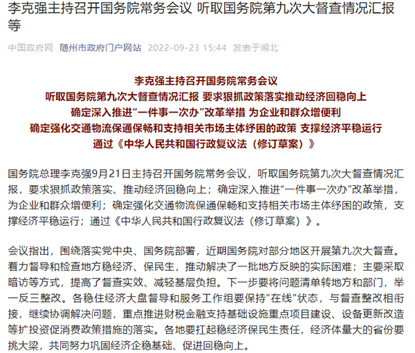 國(guó)務(wù)院總理李克強(qiáng)9月21日主持召開國(guó)務(wù)院常務(wù)會(huì)議,聽(tīng)取國(guó)務(wù)院第九次大督查情況匯報(bào),要求狠抓政策落實(shí)、推動(dòng)經(jīng)濟(jì)回穩(wěn)向上;確定深...