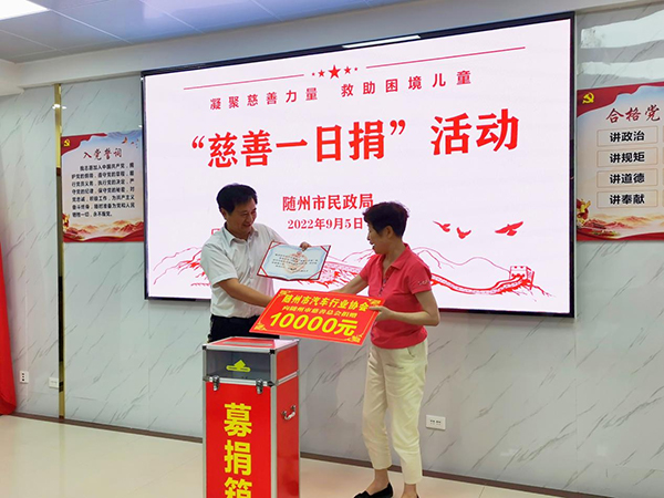 為大力弘揚中華民族樂善好施、扶危濟困的傳統(tǒng)美德,進一步營造“人人參與慈善,人人皆可慈善”的氛圍,積極響應(yīng)隨州“慈善一日捐”活動的號召,9月5日上午,隨州市汽車行業(yè)協(xié)會積極參與隨州市民政局組織開展主題為“凝聚慈善力量,救助困境兒童”的“慈善一日捐”活動。