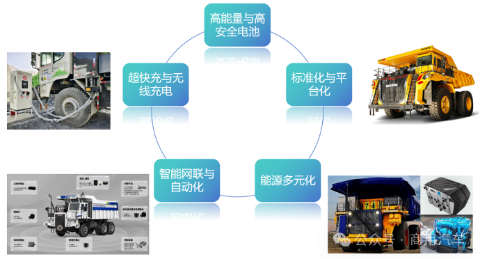 高能量與高安全電池。固態(tài)電池、硅碳負極與鋰金屬技術將進一步提升能量密度與循環(huán)壽命;超快充與無線充電。向10 MW級及以上快充技術演進,并加速無線感應補能成熟;智能網聯(lián)與自動化。依托5G/北斗及AI算法,實現(xiàn)礦區(qū)無人駕駛集群與遠程運維;能源多元混合。氫燃料電池+電池混動或插電式增程系統(tǒng),將在長循環(huán)、大負載場景中發(fā)揮協(xié)同優(yōu)勢;標準化與平臺化。推動電池、電機、電子架構和充電接口的行業(yè)標準統(tǒng)一,促進跨品牌、跨礦區(qū)互聯(lián)互通。