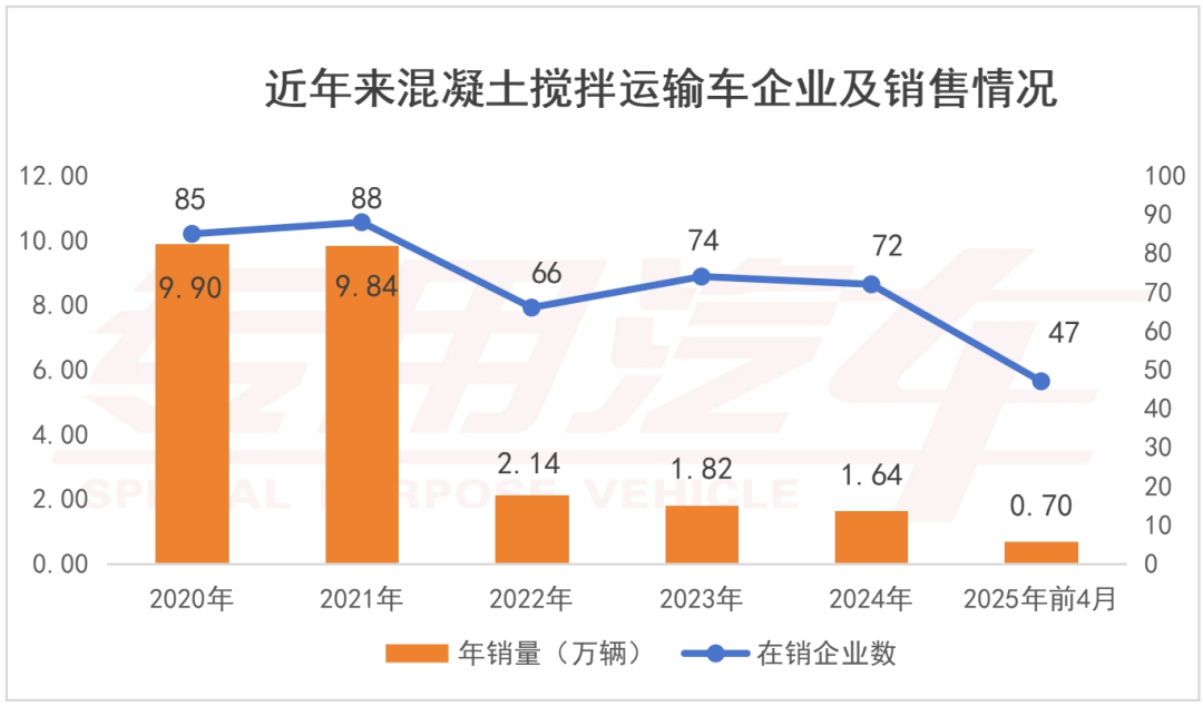 曾幾何時,攪拌車市場車水馬龍,年銷量巔峰期達9.9萬輛,卻在時代浪潮中急轉(zhuǎn)直下——2024年銷量驟降至1.64萬輛,跌幅令人咋舌。行業(yè)寒冬之下,企業(yè)生存版圖劇烈重構(gòu):從鼎盛時期的85家銳減至今年5月的47家,近半數(shù)企業(yè)黯然退場.