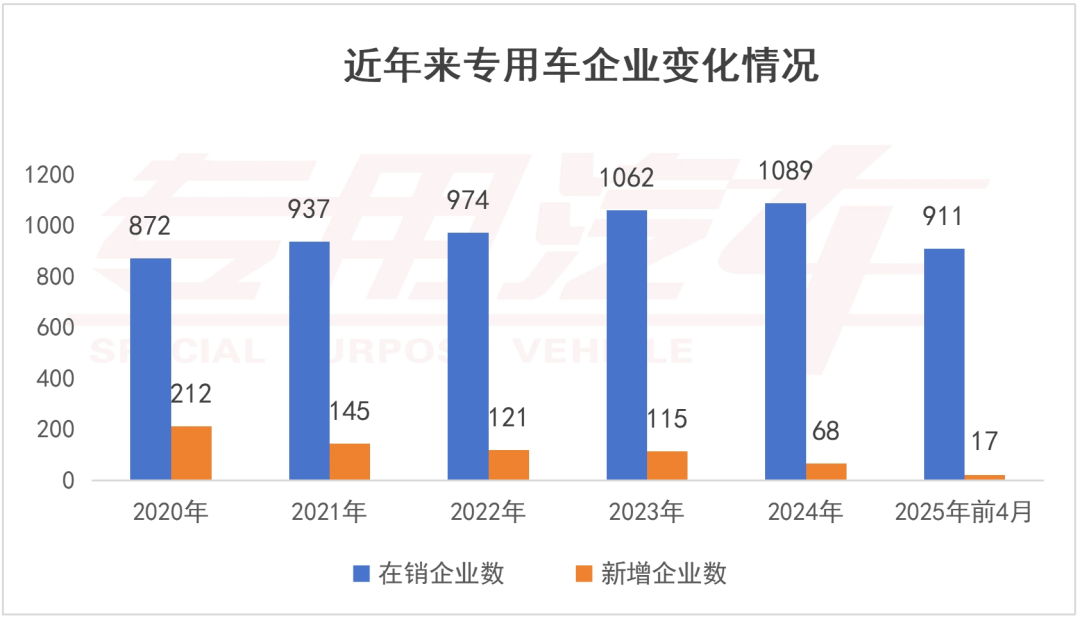 2020年至今,專用車市場猶如激烈的戰(zhàn)場:公告內(nèi)企業(yè)數(shù)量早已突破2400家,然而真正活躍在市場上的,卻僅有1000家左右。盡管每年平均有132家新企業(yè)入局,但行業(yè)整體規(guī)模卻保持穩(wěn)定。這背后,是無數(shù)企業(yè)的消失與退場,演繹著行業(yè)殘酷的生存法則。