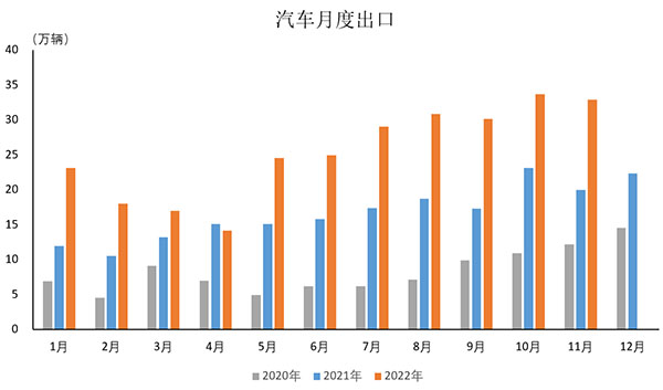 2022年11月,汽車企業(yè)出口32.9萬輛,環(huán)比下降2.5%,同比增長64.8%。