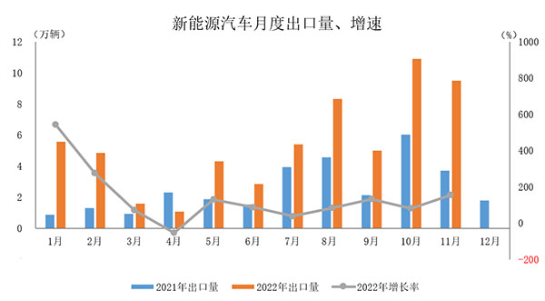 2022年1-11月,新能源汽車出口59.3萬輛,同比增長1倍。