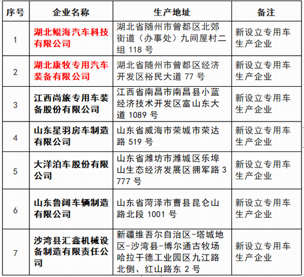 根據(jù)公示的內(nèi)容,第367批公告擬新增專用汽車生產(chǎn)企業(yè)共7家,其中我市2家,山東省3家分別位于威海、濰坊、菏澤三個城市,江西南昌和新疆沙灣縣各1家。