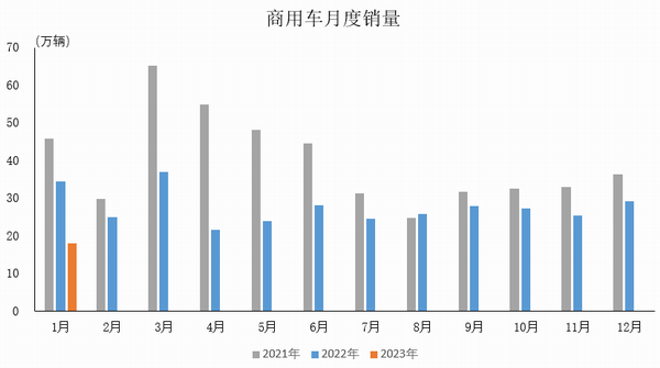 2023年1月,商用車產(chǎn)銷分別完成19.7萬輛和18萬輛,環(huán)比分別下降23.9%和38.1%,同比分別下降43.1%和47.7%。