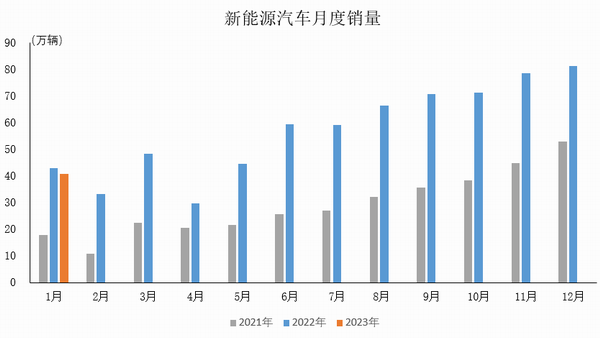 2023年1月,新能源汽車產(chǎn)銷分別完成42.5萬輛和40.8萬輛,環(huán)比分別下降46.6%和49.9%,同比分別下降6.9%和6.3%。