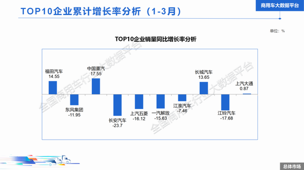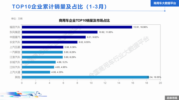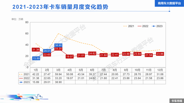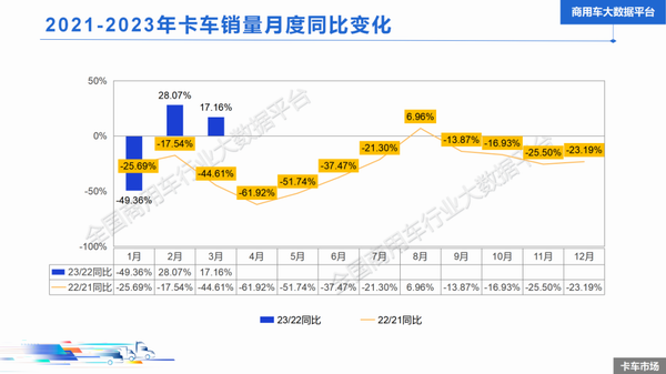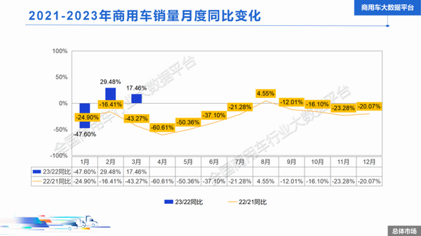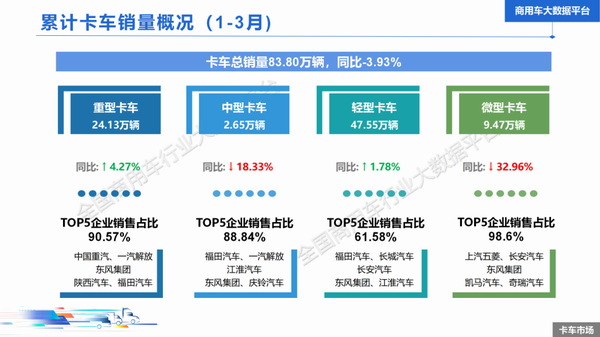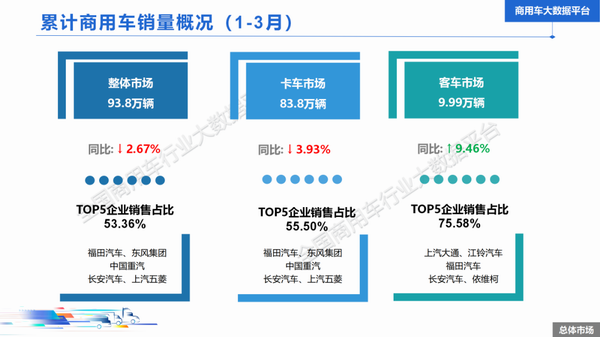 2023年1-3月全國商用車?yán)塾?jì)整體銷量(批發(fā))為93.80萬輛,累計(jì)同比下降 2.67%。