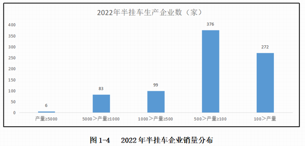 2022年全國(guó)836家半掛車企業(yè),累計(jì)生產(chǎn)半掛車39萬(wàn)輛左右,其中年產(chǎn)量小于100輛的企業(yè)272家,占比超過(guò)1/4。