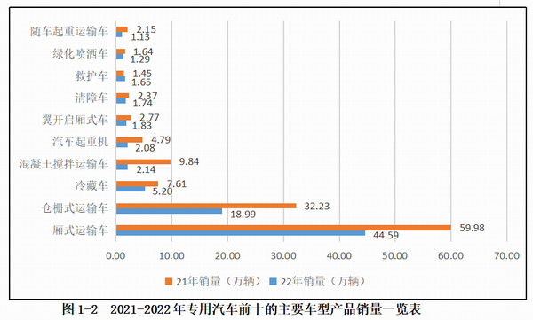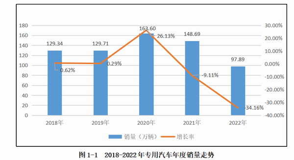 受宏觀經(jīng)濟(jì)形勢(shì)、新冠疫情、需求透支等多重因素影響,專用汽車市場(chǎng)從2021年開始呈下滑態(tài)勢(shì),2022年下滑趨勢(shì)進(jìn)一步擴(kuò)大,同比下滑34.16%,是近五年來(lái)專用汽車市場(chǎng)降幅最大的一年。