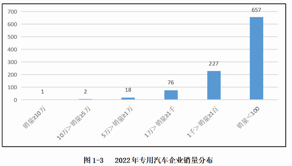 以2022年為例,2022年有銷量的專用汽車企業(yè)(不含掛車)共計(jì)981家,其中,年銷量不足100臺(tái)的企業(yè)有657家,占比接近67%。