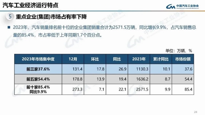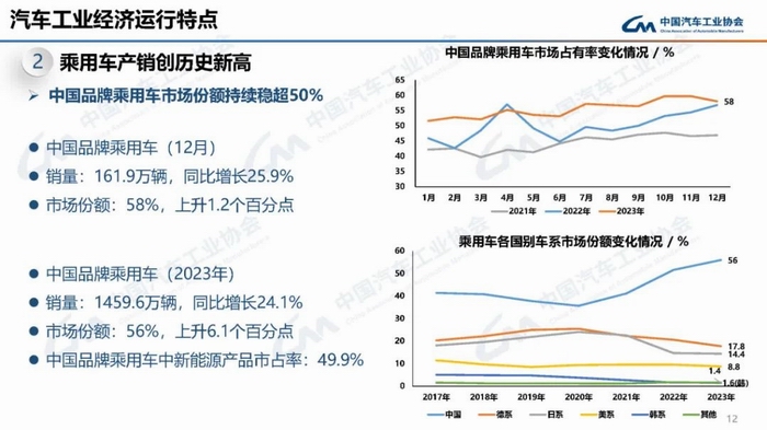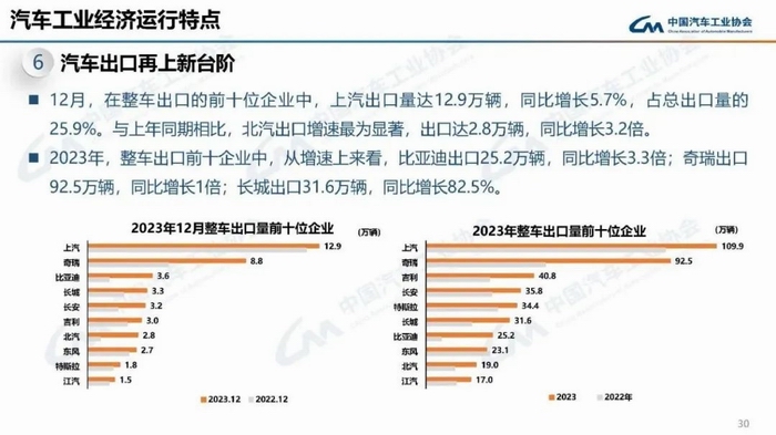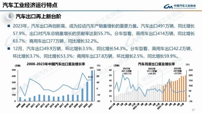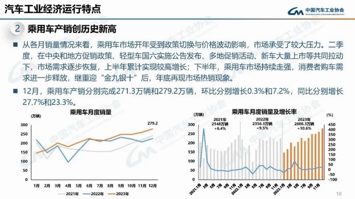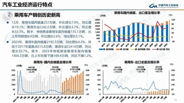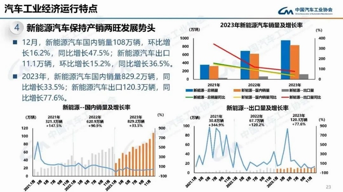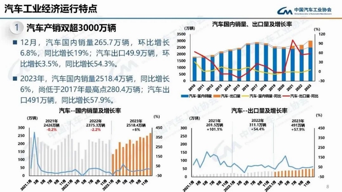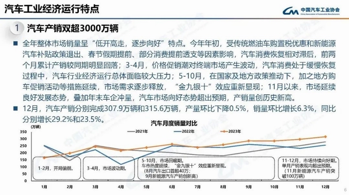 據(jù)中國汽車工業(yè)協(xié)會(huì)統(tǒng)計(jì)分析,2023年,汽車產(chǎn)銷累計(jì)完成3016.1萬輛和3009.4萬輛,同比分別增長11.6%和12%,產(chǎn)銷量創(chuàng)歷史新高,實(shí)現(xiàn)兩位數(shù)較高增長。其中,乘用車市場延續(xù)良好增長態(tài)勢(shì),為穩(wěn)住汽車消費(fèi)基本盤發(fā)揮重要作用;商用車市場企穩(wěn)回升,產(chǎn)銷回歸400萬輛;新能源汽車?yán)^續(xù)保持快速增長,產(chǎn)銷突破900萬輛,市場占有率超過30%,成為引領(lǐng)全球汽車產(chǎn)業(yè)轉(zhuǎn)型的重要力量;汽車出口再創(chuàng)新高,全年出口接近500萬輛,有效拉動(dòng)行業(yè)整體快速增長。