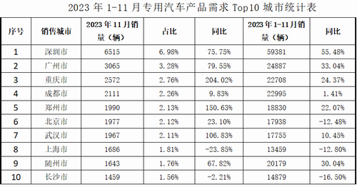 從具體城市看,深圳、廣州、重慶等大城市是專用汽車產(chǎn)品主要流向地。(2023年1-11月專用汽車產(chǎn)品需求Top10城市統(tǒng)計見下表)。