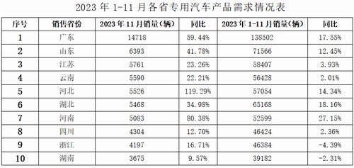 從銷售的目的地看,廣東省和山東省這兩個經(jīng)濟和運輸大省依然是我國2023年前11月專用汽車熱銷的區(qū)域,這兩省的專用汽車銷量分別達到138502輛和71566輛。(2023年1-11月各省專用汽車產(chǎn)品需求情況見下表)