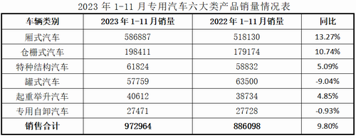 特種結(jié)構(gòu)汽車累計銷售6.18萬輛,同比上漲5.09%;罐式汽車累計銷售5.78萬輛,同比下滑9.04%;起重舉升汽車累計銷售4.06萬輛,同比上漲4.85%;專用自卸汽車累計銷售2.75萬輛,同比下滑0.93%。(2023年1-11月專用汽車六大類產(chǎn)品銷量情況見下表)