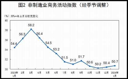 1月份,非制造業(yè)商務(wù)活動指數(shù)為50.7%,比上月上升0.3個百分點,高于臨界點,表明非制造業(yè)延續(xù)平穩(wěn)擴張走勢。