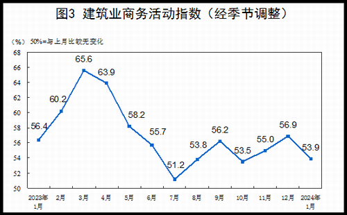 (二)建筑業(yè)商務(wù)活動指數(shù)有所回落。受冬季低溫天氣及春節(jié)假日臨近等因素影響,建筑業(yè)進入施工淡季,商務(wù)活動指數(shù)為53.9%,比上月下降3.0個百分點。從市場預(yù)期看,業(yè)務(wù)活動預(yù)期指數(shù)為61.9%,持續(xù)位于高位景氣區(qū)間,表明建筑業(yè)企業(yè)對市場發(fā)展信心較強。