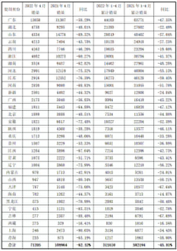 2022年4月各省專用汽車產(chǎn)品需求情況統(tǒng)計表 單位:輛