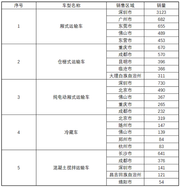 本月31個省份、自治區(qū)、直轄市(未統(tǒng)計港、澳、臺地區(qū))實現(xiàn)專用汽車銷售,其中廣東省當(dāng)月上牌13058輛,同比下滑58.29%;湖北當(dāng)月上牌4758輛,同比下滑48.81%;浙江當(dāng)月上牌4082輛,同比下滑60.27%;四川當(dāng)月上牌4163輛,同比下滑46.26%;云南當(dāng)月上牌4213輛,同比下滑43.78%。深圳市、成都市、長沙市、北京、重慶等城市是專用車產(chǎn)品主要流向地,其中11座城市月銷專用汽車數(shù)量過千(見表4)。