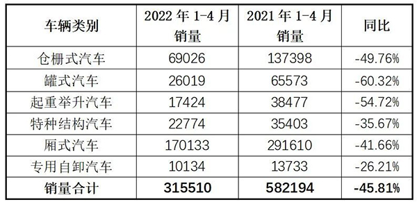 2022年1-4月專用汽車六大類產(chǎn)品累計銷售31.55萬輛,同比下滑45.81%。