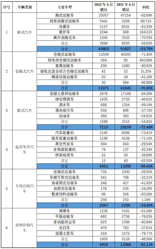 2022年4月專用汽車六大類產(chǎn)品銷量情況統(tǒng)計表 單位:輛