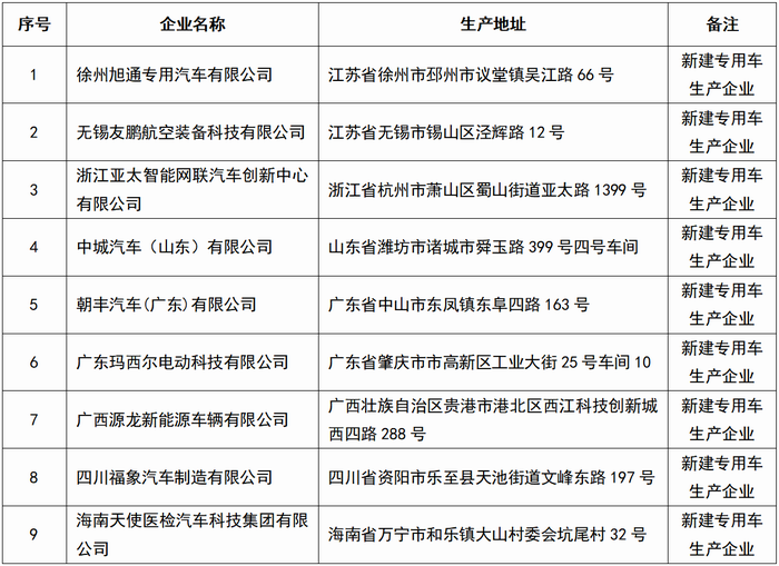 本批次《公告》擬新增的9家專用車生產(chǎn)企業(yè)涵蓋國內(nèi)7個省份,江蘇、廣東等2省份均新增2家,浙江、山東、廣西、四川、海南等5省份各新增1家。涉及9個不同城市,分別為徐州市、無錫市、杭州市、濰坊市諸城市、中山市、肇慶市、貴港市、資陽市以及萬寧市。